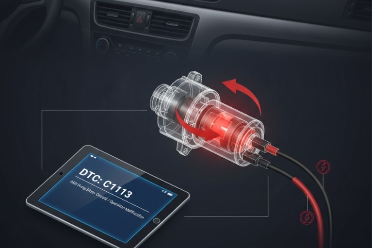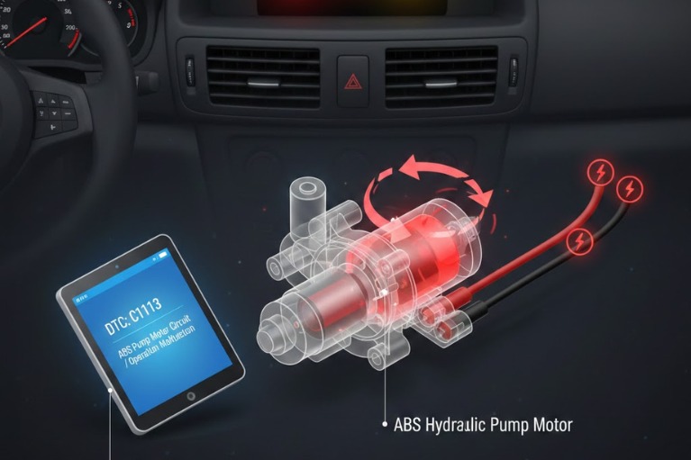Khi hệ thống ABS phát hiện bất thường liên quan đến mô-tơ bơm thủy lực hoặc mạch điều khiển bơm, ECU sẽ ghi nhận mã lỗi C1113 và vô hiệu hóa các chức năng an toàn liên quan để bảo vệ hệ thống.